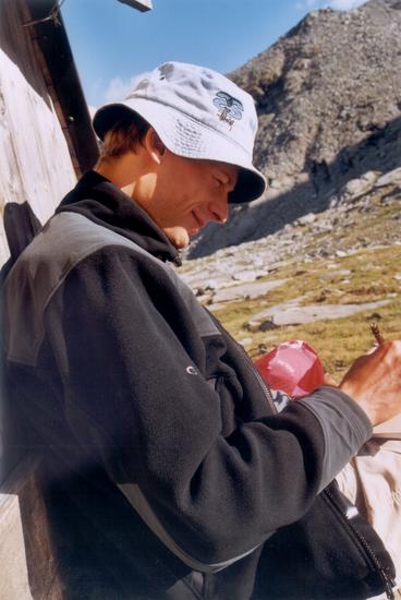 Nach einem Wasch-Ausflug zum See geniessen wir die Sonnenstrahlen vor der Schlafhütte mit Tagebuch schreiben und lesen. Nach dem