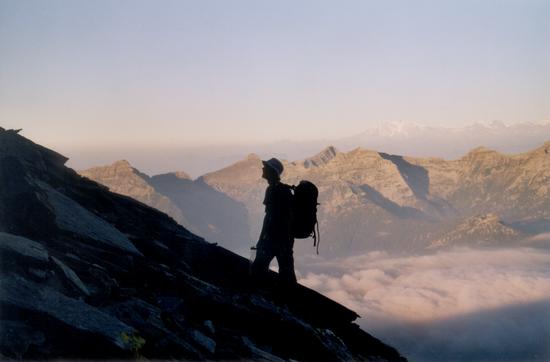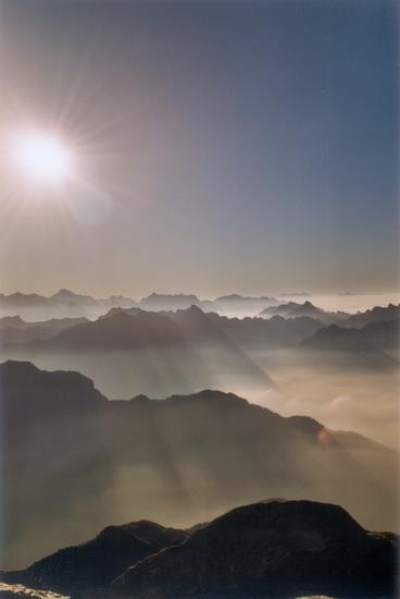 Erst Pizzo di Claro laufen wir mit leichtem Gepäck auf den Vosano - endlich wieder ein richtig schöner Tag, der uns für die Pizzo di Claro durchzogenen letzten Tage entschädigt und ein toller Abschluss unserer Ferien bildet! Die Aussicht vom Pizzo di Claro ist atemberaubend: gegen Osten das Calancatal und das Misox, deren umgebende Gipfel lange Schatten in den Pizzo di Claro Morgennebel werfen, der noch in den Tälern schwelt. Gegen Westen die Leventina und die Tessiner Spitzen, weit hinten die Walliser und Berner Alpen. Einfach schön.