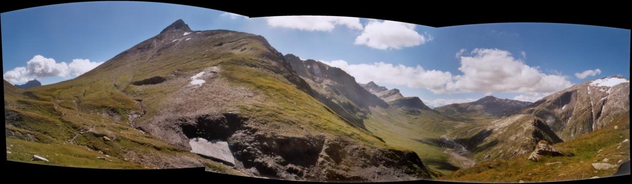 Der Panoramablick auf die wirklich sehr beeindruckende Weite, eingefasst von den umliegenden Hörnern und Graten, ist dann